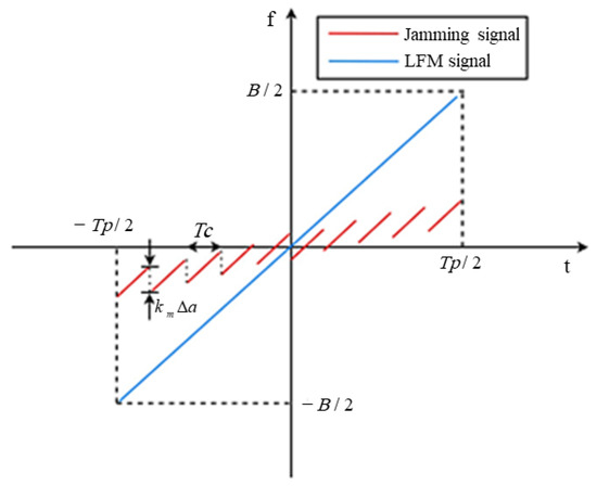 Figure 3 illustrates the time-frequency characteristics of the jamming signal following frequency modulation using the stepped wave. In comparison to the original LFM signal, the frequency of the jamming signal after modulation is no longer a single linear sweep. This deviation arises due to the opposite amplitude change trend of the stepped wave in relation to the frequency change trend of the radar’s LFM signal. Consequently, the bandwidth range of the modulated jamming signal is narrower than that of the original LFM signal. The frequency modulation coefficient is denoted as , and the frequency difference between adjacent steps is represented by . Once the radar receiver applies the matching filter, similar false targets are generated, with an adjacent distance of (where denotes the speed of light) are generated. Let denote the signal resulting from the addition of the frequency shift signal to the intercepted linear frequency modulation signal within the and segments. Neglecting the carrier frequency, this can be expressed as follows: