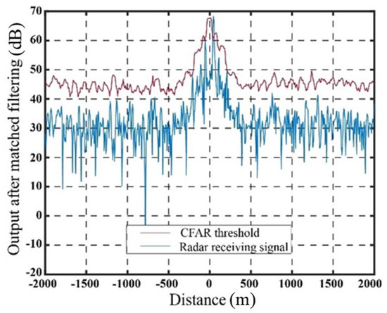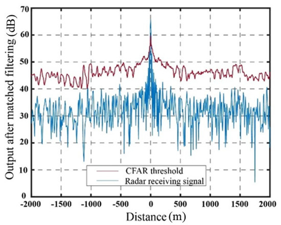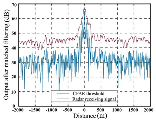 Figure 9 illustrates the output signal and the SO-CFAR detection threshold of the target echo after matched filtering in the absence of jamming. The output signal after matched filtering using the delay superposition repeater jamming method and the delay superposition step wave frequency modulation repeater jamming method, along with their corresponding SO-CFAR detection thresholds, are presented in Figure 10 and Figure 11, respectively.