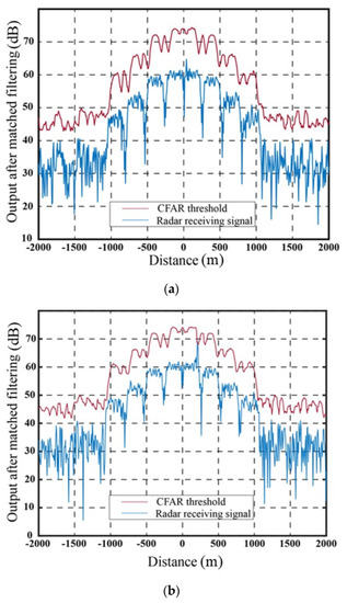Within the error range of 200 m, Figure 16a demonstrates the output results for a position error of 45 m in the delay superposition step wave modulation repeater jamming. In comparison to the jamming method involving the generation of false targets through delay superposition (as shown in Figure 10), this method transforms false targets into false target groups, enhances the CFAR threshold around real targets, and effectively improves the jamming effect under error conditions. However, when the error in real target estimation exceeds the 200 m range, the jamming effect diminishes significantly due to exceeding the coverage range of the initial false target signal group. Figure 16b illustrates the SO-CFAR detection result when the error in real target distance is 210 m, indicating a noticeable decrease in jamming effectiveness. To maintain the desired jamming effect under such circumstances, it becomes necessary to further adjust the number of segments, power compensation, and other relevant parameters according to the jamming parameter design method outlined in this study.