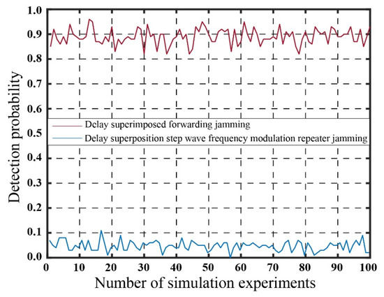 Suppose that the background noise follows a Gaussian distribution and that the variables are independent of each other. Therefore, satisfies . is composed of the noise signal and the jamming signal, which can be approximated by the detection output of the jamming target and expressed as . represents the amplitude of the (n − 1) false target jamming signal. According to [78], the detection probability of the Nth false target can be approximated as follows: