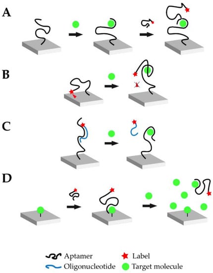 Overview of the different possible operational modes of aptasensors: (A) Sandwich or sandwich-like mode, (B) Target-induced structure switching mode, (C) Target-induced dissociation mode, (D) Competitive replacement mode (Reprinted with permission from Ref. []).