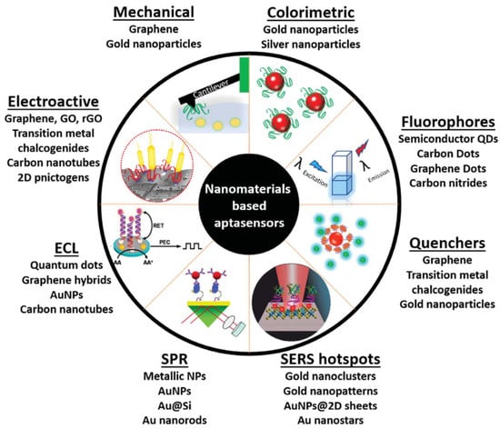 Different strategies have been developed to enhance the operational characteristics of aptasensors []. The recent advances in the field of nanomaterials have also impacted the field of biosensors [,], as illustrated in Figure 2. These nanomaterials (such as metal and metal oxide nanoparticles (NPs), nanowires (NWs), nanorods (NRs), carbon nanotubes (CNTs), graphene oxide (GO), and quantum dots (QDs)) can contribute to a more efficient transduction process, enhance the analytical performance of sensors (sensitivity, response time, reproducibility, detection limits), and potentially lead to more miniaturized devices. Following this trend, nanomaterials have been applied as functional materials in various aptasensor platforms [,,,,,].