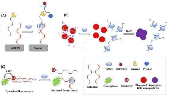 The principles of the main optical detection modes in aptasensing. (A) enzyme-based colorimetric aptasensor, (B) nanomaterial-assisted colorimetric aptasensor, (C) FRET-based aptasensor.
