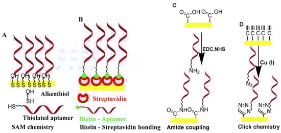 Common surface immobilization methods for aptamers. (A) SAM chemistry, (B) biotin-streptavidin bonding, (C) amide coupling, and (D) click chemistry (Reprinted with permission from Ref. []).