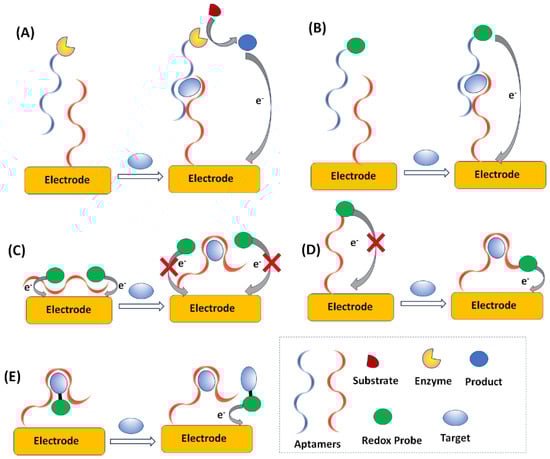 Electrochemical aptasensing modes. (A) formation of “sandwich” structure with electrochemical detection of an enzymatic product, (B) formation of “sandwich” structure with electrochemical detection of a redox probe, (C) aptamer folding, (D) electrode surface blocking, (E) displacement.