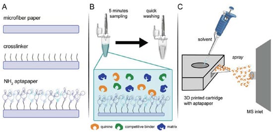 Martínez-Jarquín et al. introduced a paper platform (called “aptapaper”) modified with aptamers for the separation, preconcentration, and semi-quantitation of quinine and serotonin [] (Figure 7). After preconcentration of the targets on the aptapaper, they were detected by paper spray ionization coupled with high-resolution mass spectrometry. The LODs were 81 pg mL−1 and 1.8 ng mL−1 for quinine and serotonin, respectively.