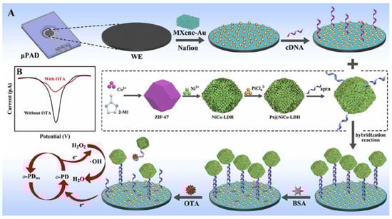 Zhang et al. have fabricated an electrochemical aptasensor to detect ochratoxin A [] (Figure 9). The complementary aptamer was attached to a MXene-Au electrode decorated with Pt nanoparticles (NPs) anchored in hollow structures of NiCo-layered double hydroxides as signal amplification materials via Au-S bonds. Then, aptamer (apta)-binding Pt@NiCo-LDH with peroxidase-like activity was immobilized through hybridization to trigger the “signal on” state, generating a significant electrochemical signal. The presence of ochratoxin A enabled the dissociation of the aptamer-complimentary aptamer hybrid, releasing signal amplification labels to achieve a “signal off” state. The aptasensor exhibited a linear range from 20 fg mL−1 to 100 ng mL−1 and an LOD of 8.9 fg mL−1.