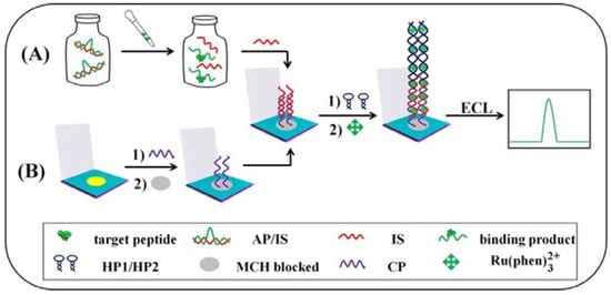 Another optical detection technique used in conjunction with aptasensors is luminescence []. Two main variants of luminescence are used in paper-based aptasensors, namely chemiluminescence (CL) and electrogenerated chemiluminescence (ECL). CL sensors are based on light generated by appropriate chemical reactions between two reactants. Compared with fluorescence, CL does not require a light source and exhibits a lower background as well as higher sensitivity. ECL relies on light generated by specific electrochemical reactions; its advantages over CL include lower background signals and higher selectivity achieved by control of the driving excitation potential or current applied to the electrode.