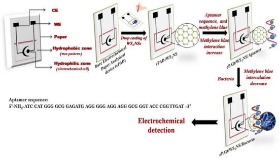 - Mishra, A.; Pilloton, R.; Jain, S.; Roy, S.; Khanuja, M.; Mathur, A.; Narang, J. Paper-Based Electrodes Conjugated with Tungsten Disulfide Nanostructure and Aptamer for Impedimetric Detection of Listeria monocytogenes. Biosensors 2022, 12, 88. [Google Scholar] [CrossRef]
