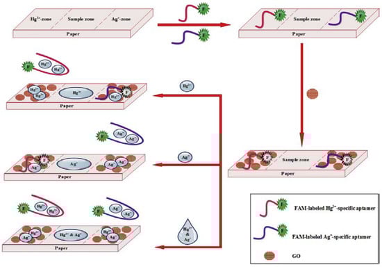 An aptasensing PAD, based on FRET, was proposed for the detection of Pb2+ []. The detection exploits conformational transformations of the Pb2+-specific aptamer that affect its binding with GO. The addition of the target Pb2+ induces the release of the specific aptamer from the GO surface, thus restoring the fluorescence emission. The linearity held in the ranges 5–70 pM and 0.07–20 nM with an LOD of 0.5 pM.