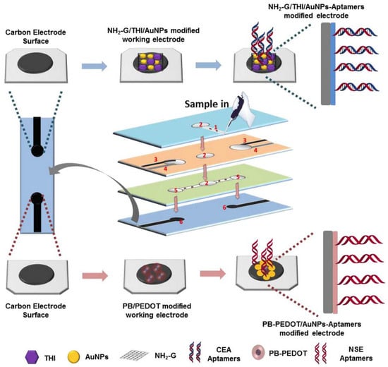 - Wang, Y.; Luo, J.; Liu, J.; Sun, S.; Xiong, Y.; Ma, Y.; Yan, S.; Yang, Y.; Yin, H.; Cai, X. Label-free microfluidic paper-based electrochemical aptasensor for ultrasensitive and simultaneous multiplexed detection of cancer biomarkers. Biosens. Bioelectron. 2019, 136, 84–90. [Google Scholar] [CrossRef]