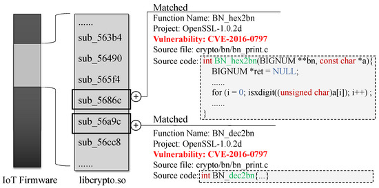 Binary code similarity detection is a fundamental technique in computer security that can detect similarities between two binary code snippets. It is widely used for various applications, including vulnerability detection [8,9,10,11,12,13,14,15,16,17,18,19,20,21,22], malware analysis [23,24,25,26,27,28], and binary patch analysis [29,30,31]. Figure 1 shows an example of BCSD usage in firmware security analysis. Given an IoT firmware without symbol tables, the BCSD approaches extract its functions and match them with functions in the vulnerability database based on function similarity to detect vulnerable functions in the firmware. For example, function sub_5686c is matched with function BN_hex2bn, which is associated with the vulnerability in the Common Vulnerabilities and Exposures (CVE) database. Furthermore, according to the BCSD results, the function name, the symbol table, the project name, and even the source code can be restored. This can locate vulnerabilities in massive IoT firmware and provide reverse analysts with critical information, e.g., source code and symbol tables.