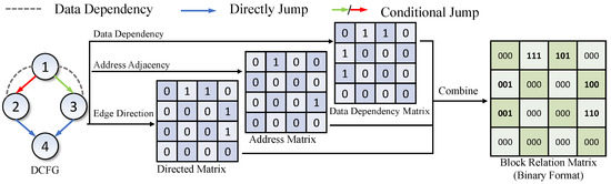 where , , , and represent the corresponding elements in the block relation matrix, directed matrix, address matrix, and data dependency matrix, respectively, and << denotes the left shift operation. The constructed block relation matrix distinguishes different relations between basic blocks. For example, the relation from Block1 to Block2 is represented as 111, the relation from Block2 to Block4 is represented as 100, and the relation from Block2 to Block3 is represented as 000, which indicates no relations.