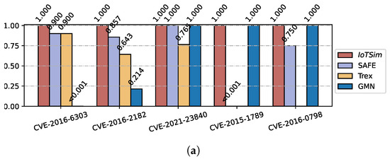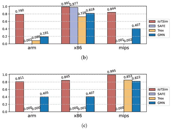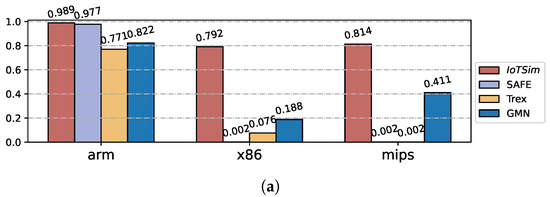 Figure 11 shows recall results in component analysis with labeled binaries from different architectures (i.e., x86, arm, and mips). IoTSim achieves high recalls in all component analysis experiments. For example, IoTSim obtains a recall of 0.814 when the input files are from mips and the labeled binaries are from arm, which means more than 80% functions in the input binaries can be correctly matched to their symbol tables and their source code. This significantly reduces the manual burden when analyzing unknown binary files. Compared with the state-of-the-art approaches, IoTSim achieves the average recall of 0.874, which improves the recall by 3.0×, 0.8× and 2.1×, compared to SAFE, GMN, and Trex.