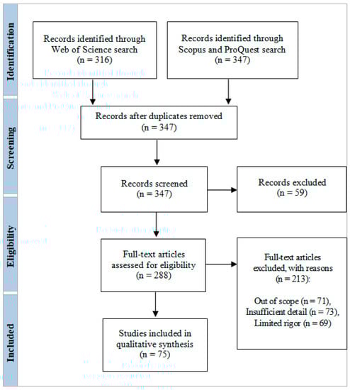 The search results and screening procedures were configured by use of a web-based Shiny app in the Preferred Reporting Items for Systematic Reviews and Meta-analysis (PRISMA) flow design. In July 2023, a quantitative literature review of major scholarly databases (ProQuest, Scopus, and the Web of Science) was carried out, and the search terms were: “cognitive radio-based IoT networks” + “spectrum sensing”, “clustering algorithms”, and “energy harvesting technology”, with the analyzed research being published between 2019 and 2023; only 347 sources qualified for initial inclusion (Table 1). A total of 75 final, mainly empirical, papers were selected for analysis. AMSTAR, DistillerSR, Eppi-Reviewer, PICO Portal, Rayyan, and ROBIS were the review software systems harnessed for screening and quality assessment, while bibliometric mapping (dimensions) and layout algorithms (VOSviewer) configured data visualization and analysis (Figure 1, Figure 2, Figure 3, Figure 4 and Figure 5).