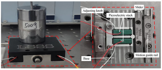 As shown in Figure 1, a bidirectional PSSA with coupled asymmetric flexure-hinge mechanisms [19] was employed, and the part marked in the red box represents its structural appearance and a schematic representation of its internal structure. The PSSA consists of an asymmetric flexure hinge, two piezoelectric stacks, a moving guide rail, and a base. The actuator exploits the coupled asymmetric flexure-hinge mechanism and symmetrical indenter to produce controllable tangential displacement. The adjusting knob on the base is used to adjust the preload between the asymmetric flexure-hinge press head and the slide block.The type of piezoelectric stack used in this paper is AE0505D16, the safe driving voltage range is 0–150 V, the size is 5 mm × 5 mm × 20 mm, and it is mechanically composed of multiple layers of piezoelectric ceramic sheets in a series. The material of the asymmetric flexure-hinge mechanism is 7075 aviation aluminum alloy, the density is 2810 kg/m3, the Young’s modulus is 7.17 × 10 N/m2, and the Poisson’s ratio is 0.33.
