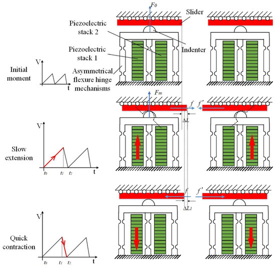 Figure 2 demonstrates the motion principle of the bidirectional PSSA with coupled asymmetric flexure-hinge mechanisms. Due to the asymmetric stiffness of the flexure hinge, both longitudinal and tangential displacements are produced by the indenter when the left or right piezoelectric stacks are distinctly stretched. At the initial moment, the exerted force on the slider due to the indenter is denoted by , which is the given preload (i.e., initially applied force). When the control signal acts on the left stacks, the slider moves to the right. On the contrary, when it acts on the right stacks, the slider moves to the left. The slider realizes continuous stick–slip movement under the action of a sawtooth wave.