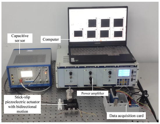 The experimental platform of this paper is presented in Figure 5. It includes a power amplifier (xe-500-c, Harbin Core Tomorrow Science and Technology Co., Ltd. of China, Harbin, China), a data acquisition card (NI cdaq-9174) and a 16-bit analog voltage output module (NI 9263), a capacitive non-contact displacement sensing system (DT6530C-CS005, Micro-Epsilon, where the resolution is 1 nm), a computer, an optical vibration isolation platform (63-9015 m, America), and a bidirectional stick–slip piezoelectric actuator with a coupled asymmetric flexure-hinge mechanism. The function of the data acquisition card and analog voltage output module is to output the analog sawtooth signal adjusted by the intelligent control algorithms to the power amplifier, and the amplified driving signal acts on the actuator. The capacitive sensor is responsible for the real-time detection and acquisition of the position information from the end of the slider. Through communication with the computer, the collected data can be transmitted to the computer control system.