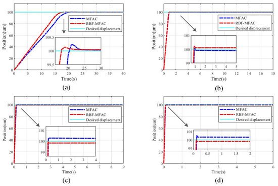 In order to show the effectiveness of the disturbance estimation, this paper divides the experiment into two groups for comparison. First, in the no-load condition, the control experiments of the MFAC and the MFAC based on the RBFNN disturbance estimation for determining the positioning control accuracy of the PSSA are verified. Before the formal experiment, the controller tracks the data collected under the open-loop drive to fit the model curve to determine the initial value of the self-learning parameters of the feedforward controller, where the controller parameters are , , , and . Let us set the sampling rate to 100 Hz for all the experiments, so that the actual displacement curve collected by the upper computer (including the closed-loop control algorithm) is the same as that of the open-loop direct drive (no control algorithms). The experimental target position is set to be equal to 100 μm, ensuring that the locking force based on the asymmetric flexure hinge is constant (i.e., the initial pressure of the indenter and the slider remains unchanged), and the value of the preload is set to 2.5 N. The comparison experiments are carried out at the sawtooth frequency levels of 1, 5, 10, 20, 40, 60, 80, and 100 Hz.