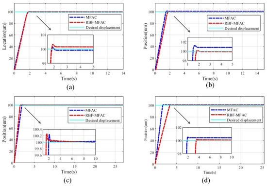 From Figure 6 and Figure 7, it can be seen that the introduction of the RBFNN disturbance estimator has a great impact on the positioning accuracy both under and without load conditions. In addition to the positioning accuracy performance, the positioning speed of the PSSA with an asymmetric flexible hinge is chiefly related to the sawtooth frequency set in the experiment. Based on Figure 6, the times taken to reach the desired positions at 1, 20, and 100 Hz are within 20, 1.5, and 0.2 s, respectively; however, the positioning accuracy will be reduced in the case of 100 Hz. Under the experimental condition with load, the driving frequency is fixed. With the increase in load, the positioning speed may also be affected; nevertheless, the driving frequency is the main factor affecting the positioning speed. During the experiment, because the output voltage regulated by the closed-loop controller has high accuracy, when the error is extremely small, the output value of the controller is also very small. Therefore, the driving force of the actuator is insufficient, resulting in a small steady-state error. In terms of the overall results, the advantages of the proposed controller are well proved.