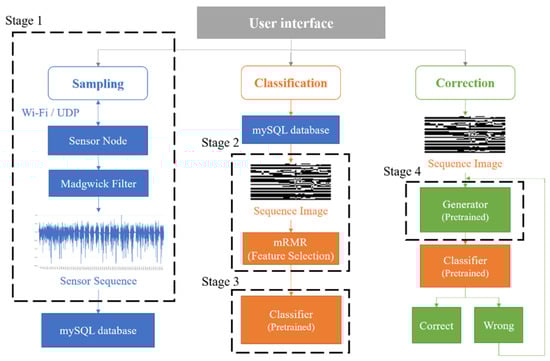 Figure 1 shows the proposed real-time HAR system architecture, which aims to achieve the data sampling of human activity, data pre-processing, real-time activity classification, data generation, and sensory correction by providing a simple UI for the users. The system implementation comprises the following four stages: