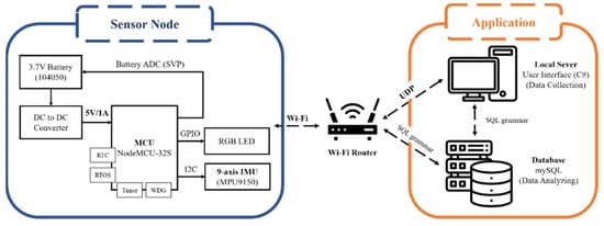 Figure 2 and Figure 3 show the system structure and hardware components of the sensor node, respectively. The nine-axis IMU is composed of a three-axis gyroscope, three-axis accelerometer, and three-axis magnetometer, which capture three-axis angular velocity, three-axis acceleration, and three-axis magnetic field signals, respectively. The inertial signals are further analyzed to obtain movement information (e.g., Euler angle, quaternion, and three-axis linear–angular velocity). Subsequently, the Madgwick gradient descent attitude algorithm is applied to minimize the quaternion error and gyroscope drift, thereby providing accurate attitude estimation. In the process of algorithm implementation, the gyroscope data are used to update the quaternion initially. Then, the acceleration data and magnetometer data are calculated and processed based on the gradient descent method to find the quaternion components with the minimum error. Finally, the two approaches are fused together to obtain the final pose quaternion. The equation for attitude estimation with gradient descent is