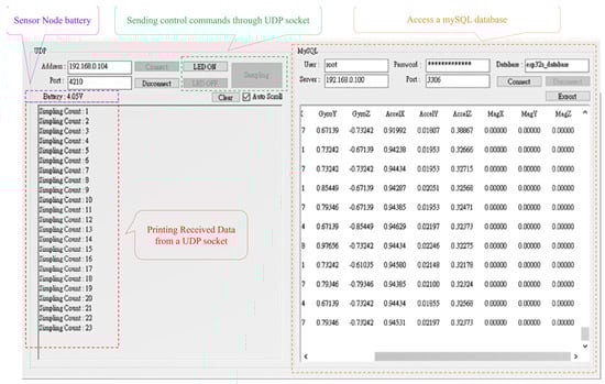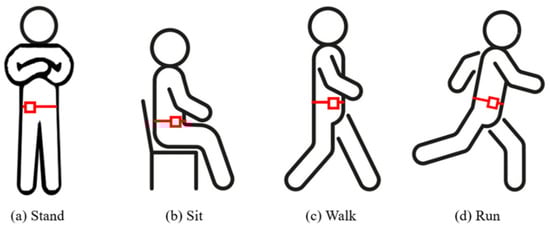 With regard to data collection, the waist-worn sensor node collects the sensing measurements of each action at a sampling rate of 10 Hz and during windows of 10 s, including standing, sitting, walking, and running activities, as shown in Figure 4. Boerema et al. [57] discuss the results of the full-body movement of IMU devices worn on various parts of the waist and investigate the optimal sensor placement used to measure physical activity. The results show that the most preferred transverse locations on the belt are the following two locations: the right hip anterior position (position 1) and the right hip most lateral position (position 2). Moreover, the exploration of how closely the sensors fit with the body suggests that to achieve the best results, the sensors should be mounted as closely as possible on the body. This tight fit can be promoted by providing mounting materials that ensure this tight fit, such as an elastic belt or a clip that has a strong connection with the belt. Therefore, with reference to [57], in this work, the sensors are located between positions 1 and 2 to facilitate wearing and ensure that the user can move freely. Moreover, we design a simple visual UI (Figure 5) using the C sharp programming language. This system allows the system to monitor the node status in a user-friendly manner and quickly access the data in the mySQL cloud database.