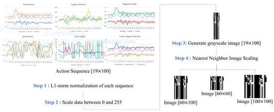 Instead of directly applying multiple inertial signal sequences as a feature, this work proposes a novel method that converts the signal sequences into new images, which can effectively express the correlation between signals [28,29,30]. Firstly, we perform the progressive L1 norm normalization of the captured action sequence data using a 19 × 100 matrix and reduce the value range of each column to [0, 1], with the sensing data being collected from the 19 parameters (i.e., three-axis angular velocity, three-axis acceleration, three-axis magnetic field, Euler angles (a set of three angles), and quaternions (containing four components), and three-axis linear angular velocities), and the action sequence of each individual parameter is represented by a 1 × 100 raw vector. We note that 100 represents the number of sampling points captured by each action at a sampling rate of 10 Hz during observation windows of 10 s. Next, we enlarge the normalized value to fit the range [0, 255] and convert it into a single-channel grayscale image with an image size of 19 × 100. Finally, we generate images of different sizes (e.g., 60 × 100, 60 × 60, and 100 × 100) based on nearest neighbor interpolation to improve the resolution, allowing us to find the most appropriate image generation method. Figure 6 describes a flowchart used to convert sequences into images.