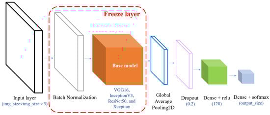 In total, 11 types of classifiers based on traditional machine learning methods are explored, namely linear SVM, poly SVM, KNN, LDA, HMM, DT, RF, AdaBoost, XGboost, LightGBM, and Catboost. Table 3 describes the hyperparameters and optimization methods used in traditional machine learning algorithms. Moreover, five neural networks of DNN, BPNN, CNN, and CapsNET based on the concept of deep learning are developed to complete action classification. Table 4 depicts the proposed model architecture and related hyperparameter optimization methods used to create deep learning algorithms. Since it may be difficult to collect enough training data, we try to change the input data type to represent an input feature that fits the input of the powerful model. Accordingly, the grayscale image is converted into an RGB image, and its size is larger than 71 × 71 based on Keras documentation. The models all stand out in the ImageNet large-scale visual recognition challenge (ILSVRC) large-scale comparison, such as VGG16, InceptionV3, ResNet50, and Xception. Data migration is performed, extending from the well-trained source domain to the target training domain, based on the fine-tuning training method used to realize transfer learning and improve the model’s accuracy. Figure 7 presents the model’s architecture based on transfer learning performed in this study.