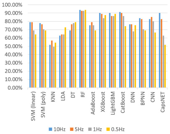As the sampling rate decreases, the number of data features is reduced, which cuts down the model’s size and complexity, but may degrade the model’s effectiveness and classification accuracy. Thus, we perform down-sampling processing on the sequence of the original 10-hertz sampling rate (e.g., 5 Hz, 1 Hz, and 0.5 Hz) to find an appropriate sampling rate. Figure 8 shows the accuracy of directly feeding the sequence into various classifiers by varying the sampling frequency. The results show that a sampling rate of 10 Hz is generally a sensible setting among all classifiers.