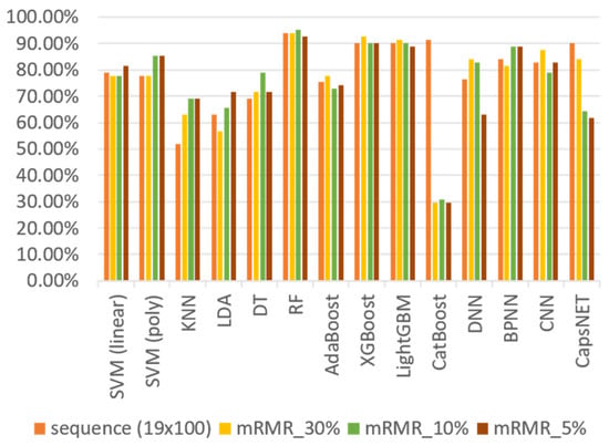 To reduce the training time and prevent overfitting due to the influence of unimportant features, the mRMR method is applied to screen the features of the sequential input. Accordingly, the k features with the highest correlation and the least redundancy in the category are selected, while the selected features are fed into the classification model to perform training. Figure 9 shows the classification results without feature engineering and those determined via the mRMR method.