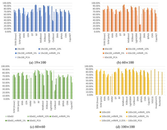 Considering the traditional machine learning classifiers, Figure 9 and Figure 10 show that regardless of the feature processing method applied, the classification results of RF and XGBoost are generally the best options. Table 6 lists the accuracy results of RF and XGBoost with the original features and those determined via the feature engineering methods. The results show that when the image size is 100 × 100 and we select the best features with 5% of the original feature quantity based on using mRMR as the feature input, we can find the best classification results. The accuracies of RF and XGBoost via feature engineering are 95.06% and 93.83%, respectively, increasing the accuracies by 1.31% and 2.70%, respectively. We notice that although the accuracy of RF is higher than that of XGBoost, RF has the characteristics of being better at classifying known data but performing poorly on unknown data. Therefore, to ensure that the developed classifier has a wider availability in the real-time field, a large amount of user training data may be required. However, this approach may not only cause inconvenience to the subjects, but also lead to the possibility of overfitting the model by collecting too many similar data. Therefore, we propose a variety of generators to generate training data and load the newly generated data into the previously pre-trained RF and XGBoost classifiers to determine the desired classifier with the highest generalization capability.