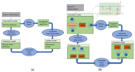 - Liu, H.; Zhang, H.; Mertz, C. DeepDA: LSTM-based deep data association network for multi-targets tracking in clutter. In Proceedings of the 2019 22th International Conference on Information Fusion (FUSION), Ottawa, ON, Canada, 2–5 July 2019; IEEE: Piscataway, NJ, USA, 2019; pp. 1–8. [Google Scholar]