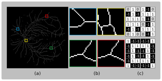 (a) Skeleton of fundus image (A) and (b) samples of bifurcation patterns detected over the skeleton. (c) Structuring elements (B), where white, black, and gray pixels represent the skeleton pattern, background, and the indifference of the searched pattern, respectively.