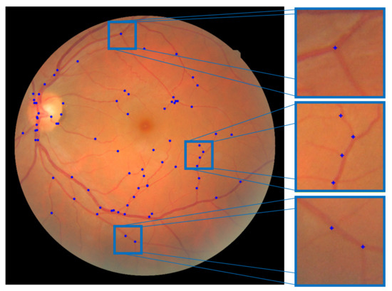 After detecting these patterns, the positions of bifurcations are identified, defining the feature points. Figure 7 illustrates the result of feature extraction from a fundus image.