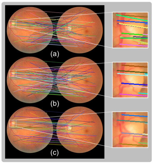 Similarly, Rivas-Villar et al. [20] adopted deep learning for the detection of bifurcations and crossovers of the retinal blood vessels. Their method, which represents the first deep learning feature-based registration method in fundus imaging, utilized a neural network for keypoint detection, and RANSAC (random sample consensus) was used to match the key points, without the need for complex descriptors.