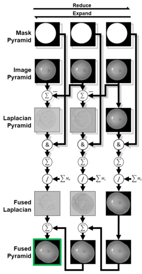 The employed method is initiated by constructing Laplacian pyramids for the two images. These pyramids are generated through image subsampling, followed by upsampling and the computation of the difference between each level and its previous octave, yielding the respective Laplacian for the octave. Next, element-wise multiplication occurs between the Laplacian and the fundus image’s mask, after which the Laplacians from both images are added. Since there is an overlapping region, preserving exposure and preventing overflow necessitate division of the Laplacian addition by the sum of the masks from both the source and target images, resulting in the fused Laplacians. Finally, the blending result is obtained by upsampling the fused Laplacian from the last octave and adding it to the fused Laplacian from the previous octave, with this process repeated until the original dimension is restored. Figure 10 depicts an illustration of this image-blending process.