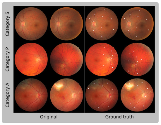 The FIRE dataset comprises 129 retinal images with a resolution of 2912 × 2912 and a field of view of 45°, forming 134 image pairs [18]. These images belong to 39 patients ranging in age from 19 to 67 years and are categorized into three different classes, each with a distinct registration application: category S is intended for super resolution, category P for mosaicking, and category A for longitudinal studies. Among these categories, only category A contains registrable pairs with anatomical changes, such as vessel tortuosity, microaneurysms, and cotton-wool spots. Table 1 provides a summary of the characteristics of the FIRE dataset, while Figure 11 illustrates the registrable image pairs, along with their respective ground-truth control points, for each category.