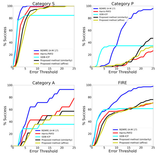It is evident from Figure 12 that results vary significantly across different categories. Categories S and A, with larger overlapping regions, are expected to yield a higher number of correspondences, leading to better matching performance. Conversely, category P may face challenges, as the number of potential matches is limited to the overlapping area between fundus images. In category S, the GDB-ICP method shows outstanding performance, with numerous successful registrations and small registration errors. However, it achieves successful registration for only 84.5% of the category, while both the proposed method and the Harris-PIIFD method achieve 100% success, with a greater tolerance of registration errors. In category A, the Harris-PIIFD method stands out, with a success rate of 78.51%, while the proposed method reaches a maximum of 57.15%. Each method in this category shows low success rates for small registration errors. Furthermore, for category P, the GDB-ICP method outperforms the other presented methods, but with a greater tolerance to error, the proposed method’s success rate surpasses that of GDB-ICP. Table 3 provides more details on the registration errors for the methods compared in Figure 12, which are similar that of the method presented in this paper in terms of feature extraction. By analyzing the area under the curve (AUC) (Table 2), it is evident that the proposed method outperforms GDB-ICP in both category S and category A. In category P, the proposed method’s performance surpasses that of the Harris-PIIFD method.
