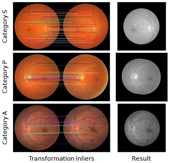 Following feature matching between fundus images, the correspondences are employed to map the source image to the target image. A 2D planar transformation model is used to represent this relation. Given a point (P) over a planar surface, with projections ( and ) over two images, the transformation matrix (T) represents the transformation that relates and for any given point on the surface; this means . Different planar transformation models may be employed to relate the images, each preserving different features. Projective, affine, and similarity transformations have been used to register fundus image pairs in different applications [20,22,26,37,50,51,52,53]. Although some fundus registration applications employ these or more complex transformation models, in [54], it was demonstrated that the optimal mapping differs depending on the registered image pair. Then, since similarity and affine transformations have the advantage of requiring fewer correspondences for computation of their matrix and the simplicity of their computation, such models employed in this application, as some image pairs with anatomical changes caused by diseases may have a scarce number of correspondences.