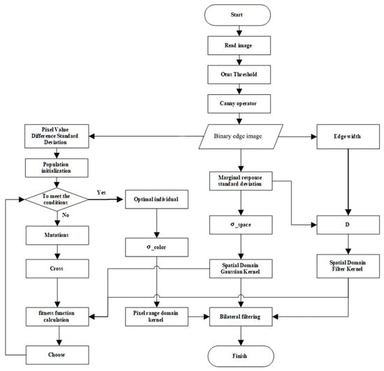 The parameters of the bilateral filter, such as the spatial domain filter kernel and the standard deviation of the spatial domain Gaussian kernel, are adjusted using the Canny operator. First, the Otsu thresholding technique is used to adjust the high and low thresholds ( and , respectively) of the Canny edge detection operator: