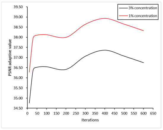 The PSNR is a metric used for evaluating image quality []. It quantifies the ratio between the signal and the noise by using the maximum possible signal value as a reference. The PSNR is commonly used to compare the disparity in quality between an image and its post-processed version, such as after compression or denoising. The calculation formula for the PSNR is as follows: