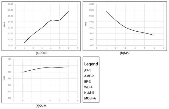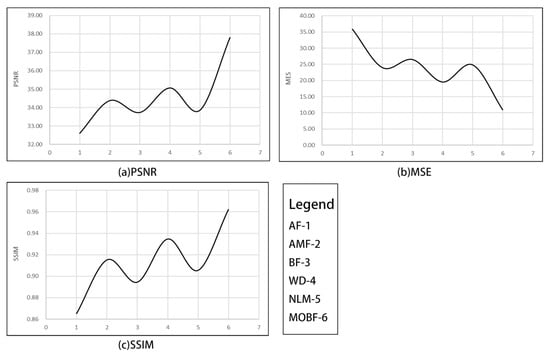 As can be seen from Figure 3, the MOBF algorithm outperformed other methods in terms of the denoising performance on GF-1 images. Notably, as can be seen in Figure 3f, the preserved texture details within the rectangular box region were visually more prominent than those obtained using other algorithms. Furthermore, as can be observed from the data presented in Table 1, the MOBF algorithm achieved the highest PSNR and SSIM values and the lowest MSE value across images with different noise densities. The algorithm performance is shown in Figure 4.