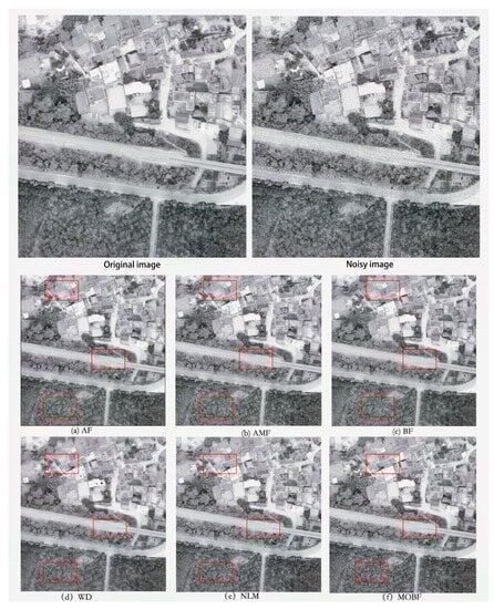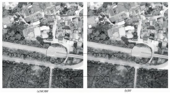 As can be seen in Figure 4, the AF, AMF, BF, WD, and NLM algorithms exhibited a considerably higher level of the smoothing effect within the rectangular box region after denoising, surpassing the performance of the MOBF algorithm. However, these algorithms sacrificed some texture details in the process. A further analysis and comparison of the BF and MOBF algorithms revealed that optimized bilateral filtering excels at preserving the edge details of building rooftops, roads, and vegetation areas. A comparison of the BF and MOBF algorithms is shown in Figure 6.