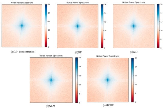 In the noise power spectral density plot, a high energy in the high-frequency region indicates the existence of high-frequency noise in the image, a high energy in the mid-frequency region indicates a considerable amount of detail and a lower level of image smoothness, and a higher energy in the low-frequency region is indicative of increased brightness and contrast in the image, leading to an overall brighter appearance. As can be observed from Figure 8, the denoising effectiveness was in the following order: MOBF algorithm > BF algorithm > NLM algorithm > WD algorithm.