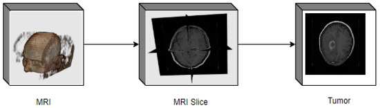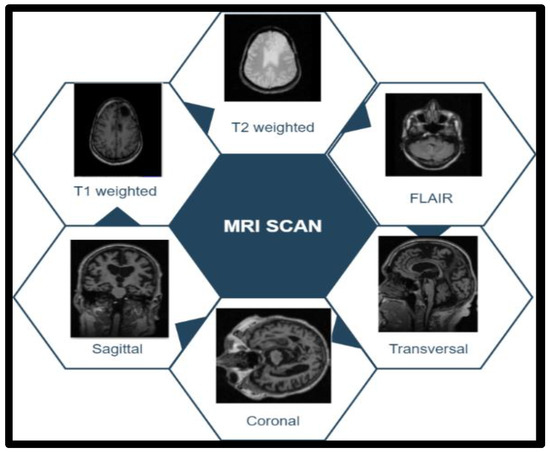 T1 images represent white matter in white (internal tissue area) and grey matter (external tissue area) in grey [28]. In the case of T2-weighted images, it is white for grey matter and grey for white matter. FLAIR visualization allowed the radiologist to properly visualize the brain tissue by removing the brain’s fluid material (water and brain fluid) through sagittal, coronal, and transverse MRI scan tranches. Figure 3 shows tumor image categories in a dataset. The training in set included 70% of the total images, the validation set contained 20%, and the testing set included 10%. The picture sequences T1, T2, and FLAIR were used for the proposed function.