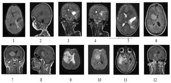 The proposed model utilized the online KaggleBraTS 2018 dataset [27]. A single image session with visualization parameters of MRI scanners included (Siemens, Erlangen, Germany): Repetition Time T.R. = 9.8 ms, Echo Time T.E. = 4.0 ms, Rotating angle = 10, Inversion Recovery Time T.I. = 20 ms, Delay Time T.D. = 200 ms, 128 sagittal 1.25 mm gapless slices, and 256: 256 (1 × 1 mm) pixel size in the image dataset [28]. The clinical tumor case between 21 and 37 was used with 1696 images, 12 in Figure 2. Brain imaging samples of MR (magnetic resonance imaging) were classified as images of T1, T2, FLAIR (fluid-attenuated reversal recovery), and MRS (magnetic resonance spectroscopy).