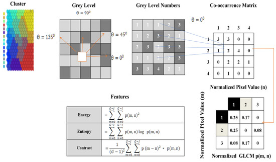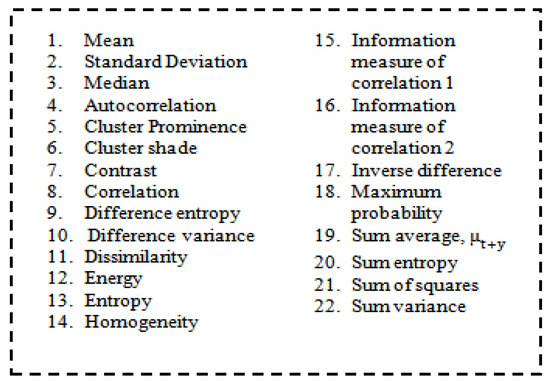 The order of statics was as follows: first-order texture steps were statistics reported from the original image values, such as variance, and pixel neighbour relationships were not implemented. Second-order measures describe the relationship between groups of two (usually adjacent) pixels in the original image. GLCM is the feature extraction tool used to analyze the textures considered for examining feature analysis [44]. Figure 5 shows how the grey-level co-occurrence matrix features differentiated the surface of an image by measuring how often pixel pairs of different values and in a given spatial relationship occurred in a photo [45], generating a matrix and then extracting the statistical measures described in Figure 6.