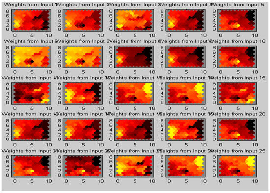 Both factors are inversely proportional to time, so it decreases over time. The incremental process reduces as the neighbourhood weight factor falls, which is a few units. Here, it indicates the position of the exit space and is the distance between the winning unit and the space. The Euclidean distance is computed as . However, after the initial process, the orthogonal and symmetric matrices T and P of the same size, where T (p, q) means 0 for no relation, 1 is a connected neuron, and P (p, q) indicates the boundary age of the neurons [21]. The neurons are nearest neighbours in the present era, meaning there is 0. Yet, another value means neurons are the closest neighbours. The MTr threshold is a function of the data dimension (D) given by the MTr threshold [34,35,36].