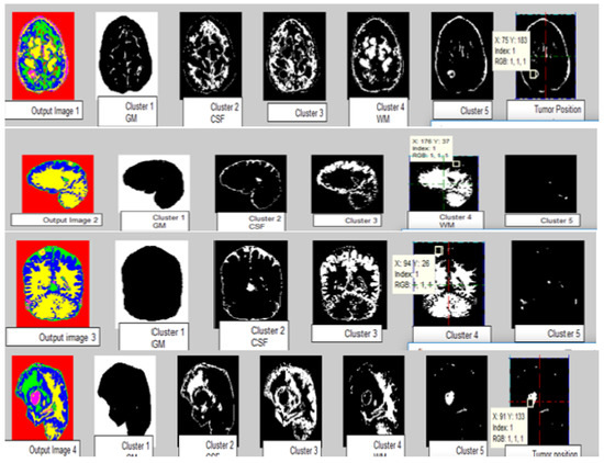 The images of different clusters formed during the clustering extraction of the tumor region are clearly illustrated in Figure 9. Perfect tumor identification and tissue segmentation with other sets for size estimation are shown in Figure 9. Output Image 1 produced five clusters with an exact tumor in cluster 5 with positions X = 75 mm and Y = 183 mm. Output Image 2 had five clusters with positions X = 176 mm and Y = 37 mm. Output Image 3 with position X = 94 mm, Y = 26 mm. Output Image 4 had five clusters with positions X = 99 mm and Y = 133 mm.